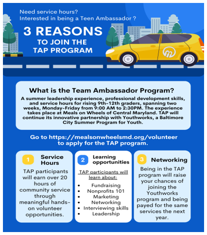 A summer leadership experience, professional development skills, and service hours for rising 9th-12th graders, spanning two weeks, Monday-Friday from 9:00 AM to 2:30PM. The experience takes place at Meals on Wheels of Central Maryland. TAP will continues its innovative partnership with Youthworks, a Baltimore City Summer Program for Youth.